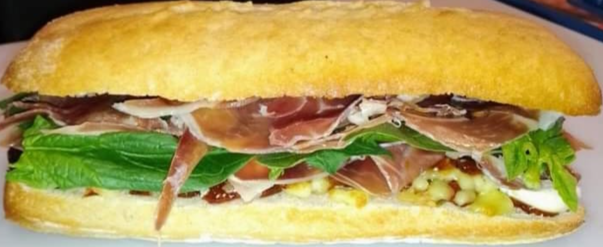 Jamón serrano y queso Philadelphia. Base de aderezo, jitomate, aguacate, cebolla y lechuga, con guarnición de papas saratoga.