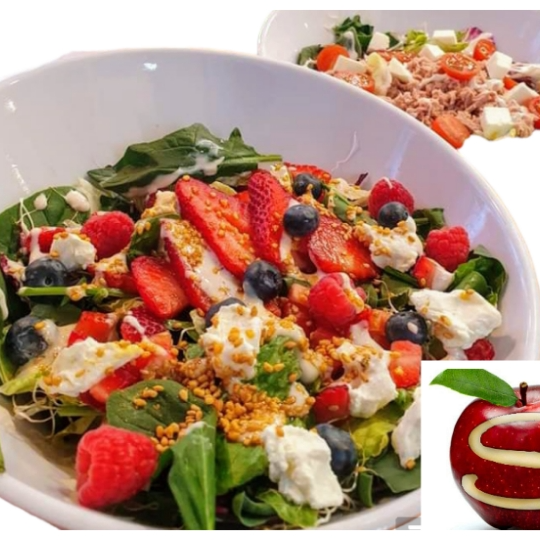 Zarzamora, fresa, arándanos, espinaca y queso. Todas nuestras ensaladas incluyen cama de lechuga y aderezo.