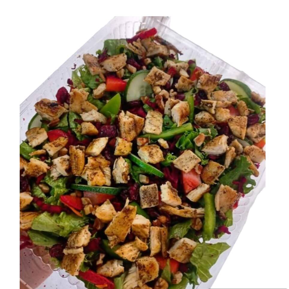 Zanahoria, pepino, jícama, jitomate y pollo a la plancha. Todas nuestras ensaladas incluyen cama de lechuga y aderezo.