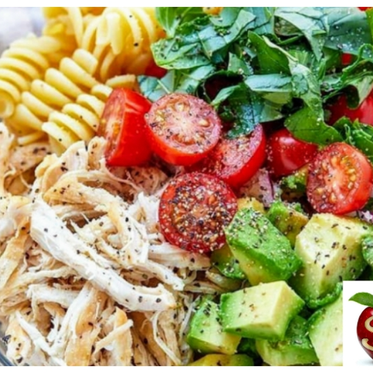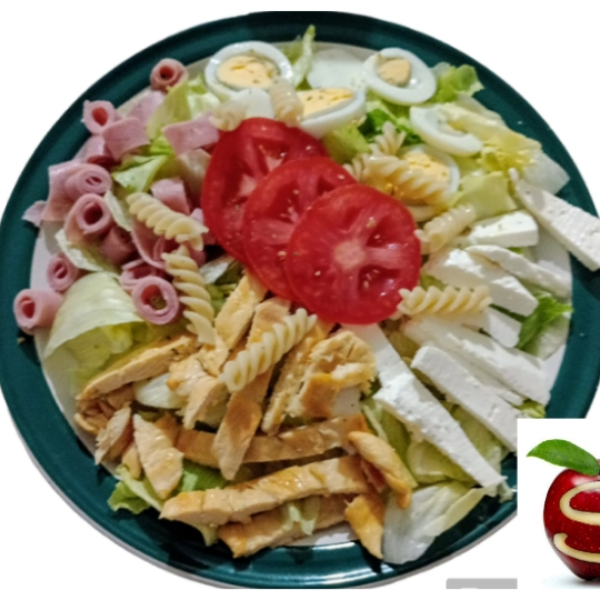 Pasta fussilli, aceitunas negras, tomates cherry, champiñones y pollo. Todas nuestras ensaladas incluyen cama de lechuga y aderezo.