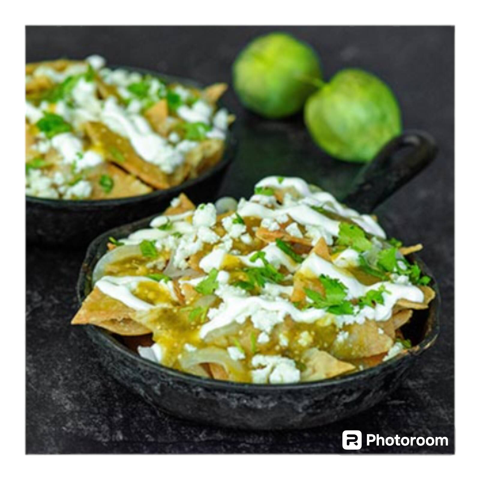Deliciosos totopos horneados bañados con salsa verde gourmet, crema y queso.