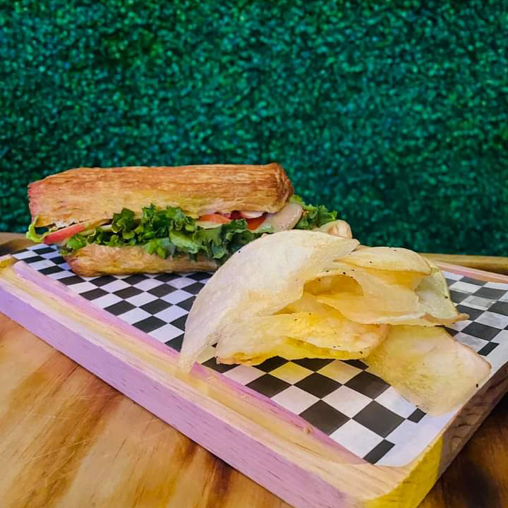 Jamón de Pavo y Manzana. Base aderezo, jitomate, aguacate, cebolla, lechuga con guarnición de Papas Saratoga