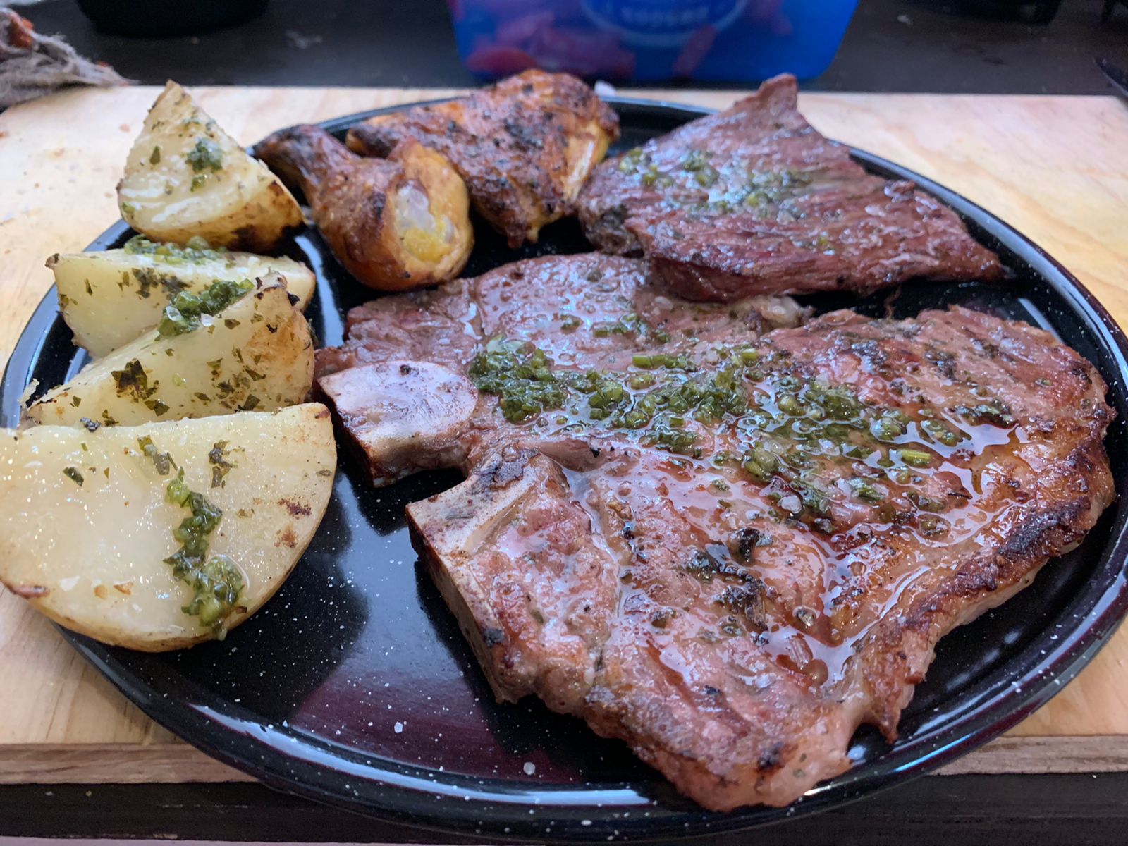 11 Bones, 1/2 de arrachera, 1/4 de pollo, 1 chorizo, ensalada y papas.