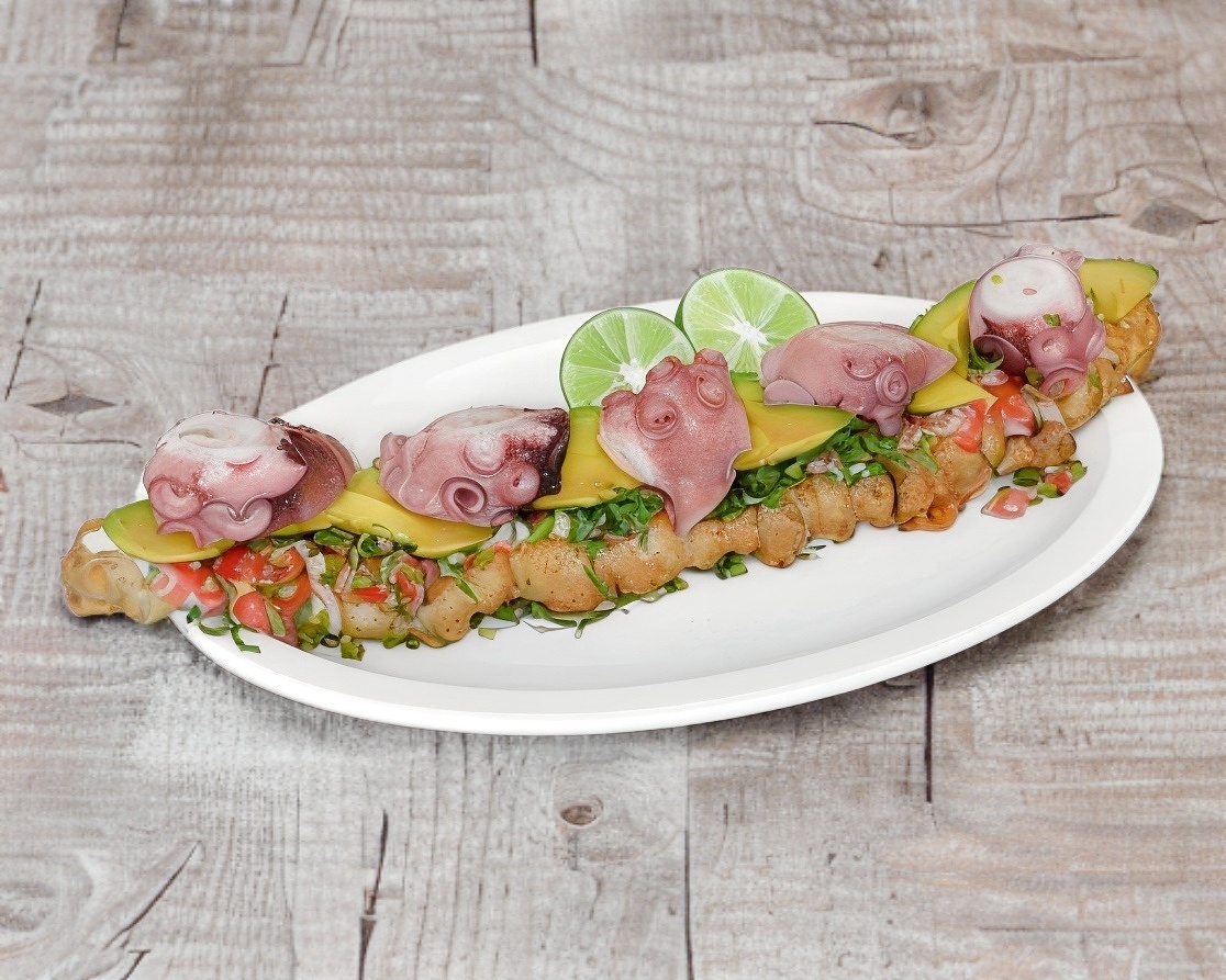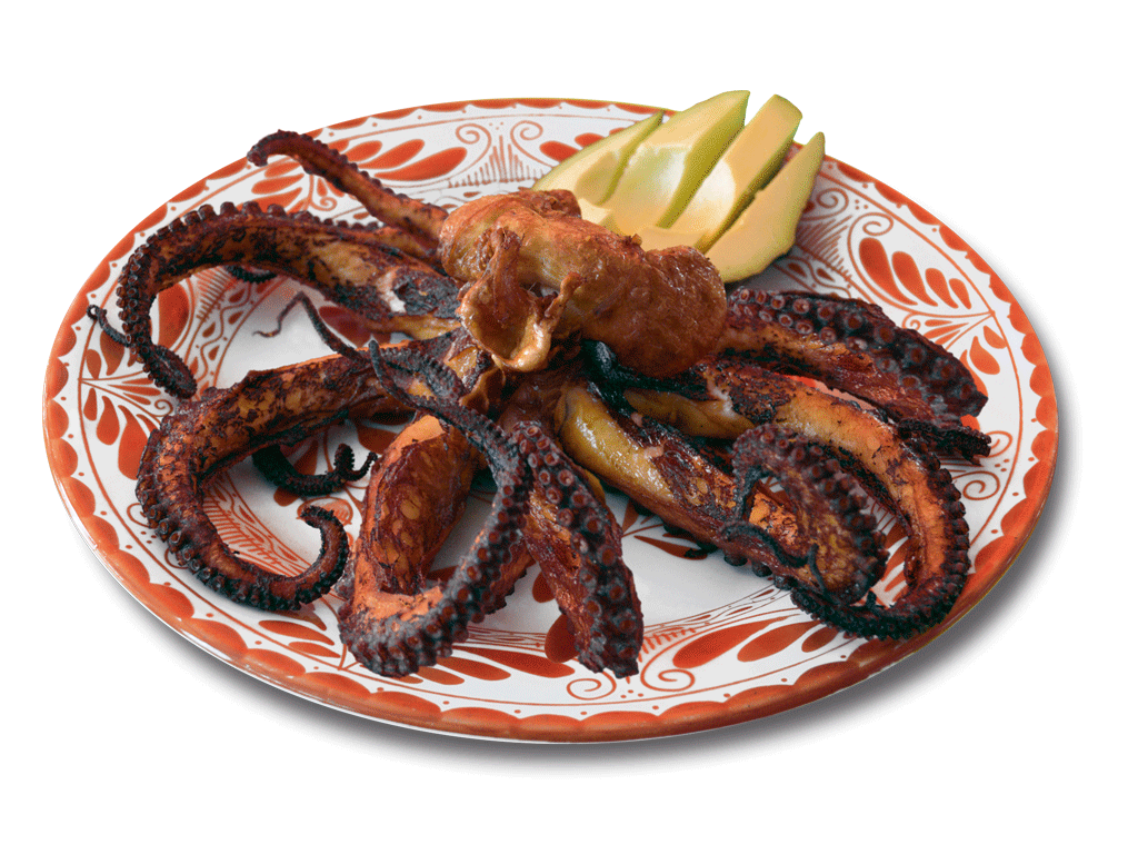 pulpo dorado con una guarnicion de aguacate