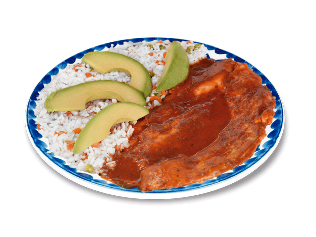 Suave filete de pescado banado en salasa ala diabla, acompañada de una porcion de arroz ala jardinera y rebanadas de aguacate