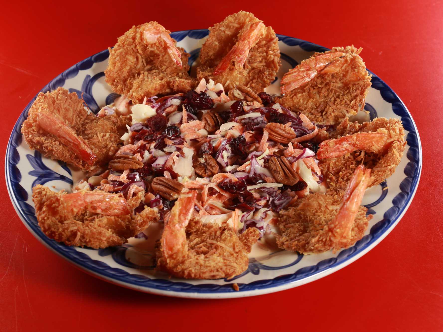 camarones empanizados al coco con ensalada de col