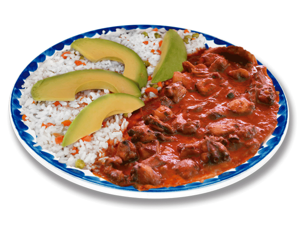 trocitos de pulpo bañados en salasa ala diabla,acvompañados de una porcion de arroz ala jardinera y aguacate