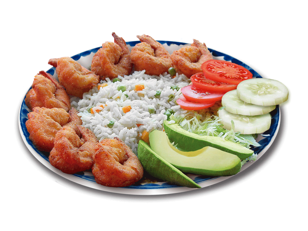 camarones pelados,acompanados de una porcion de aroz ala jardinera,mas guarnicion de ensalada de lechuga,pepino,jitomatey aguacate
