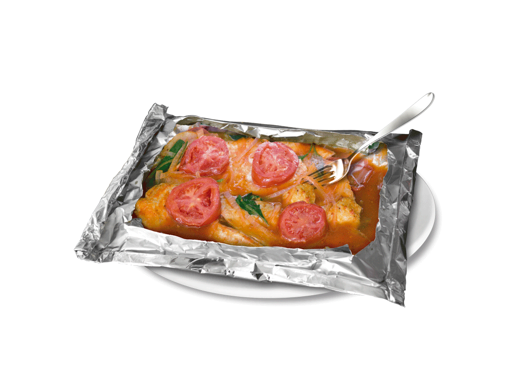 filete de pescado a vapor en caldillo de jitomate con rodajas de cebolla y chile cuarezmeño y hojas de epazote