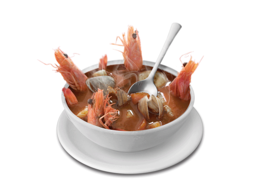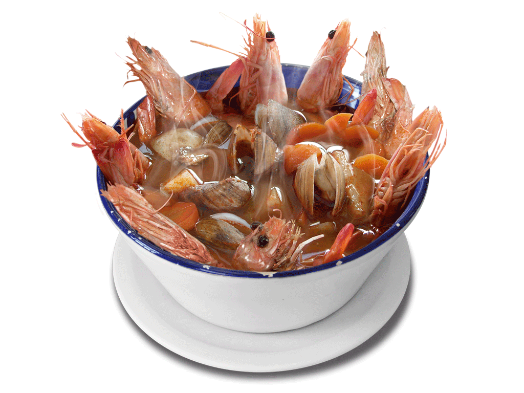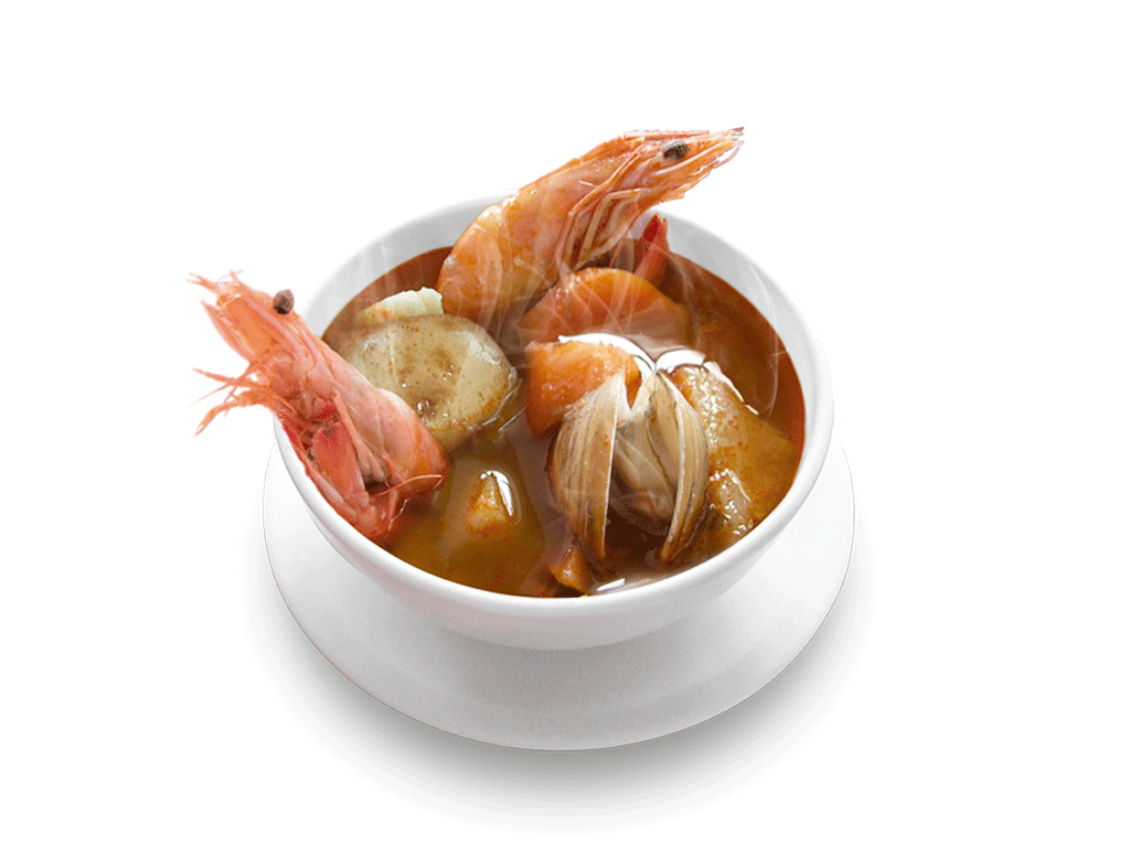 8 camarones,almejas,papa y zanahoria en un rico caldo picante