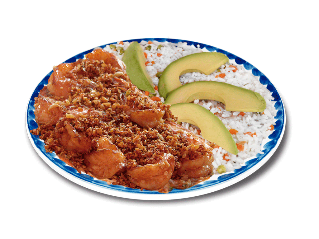 camarones pelados,sazonados con trocitos de ajo, acompañados de una porcion de arros ala jardinera y aguacate