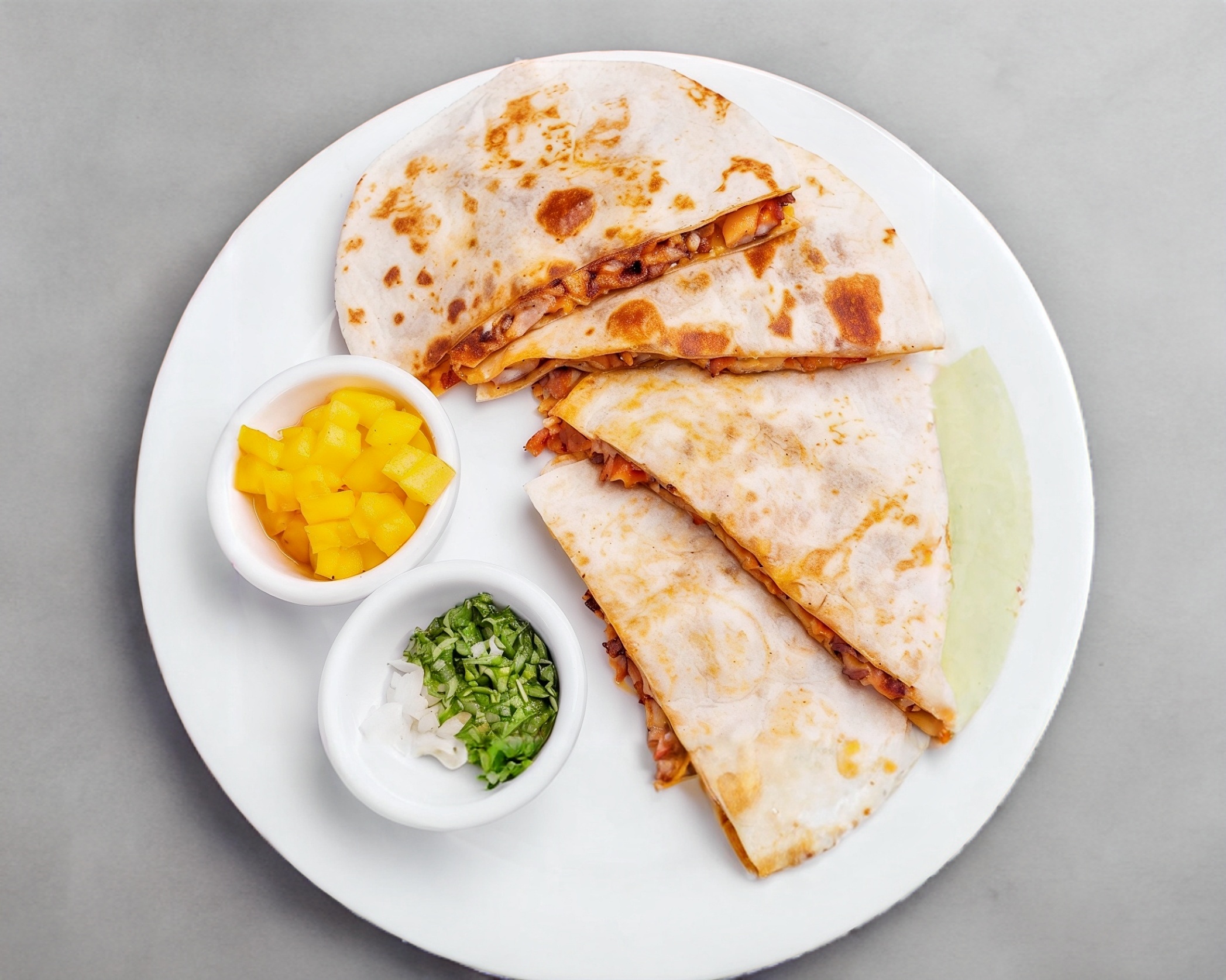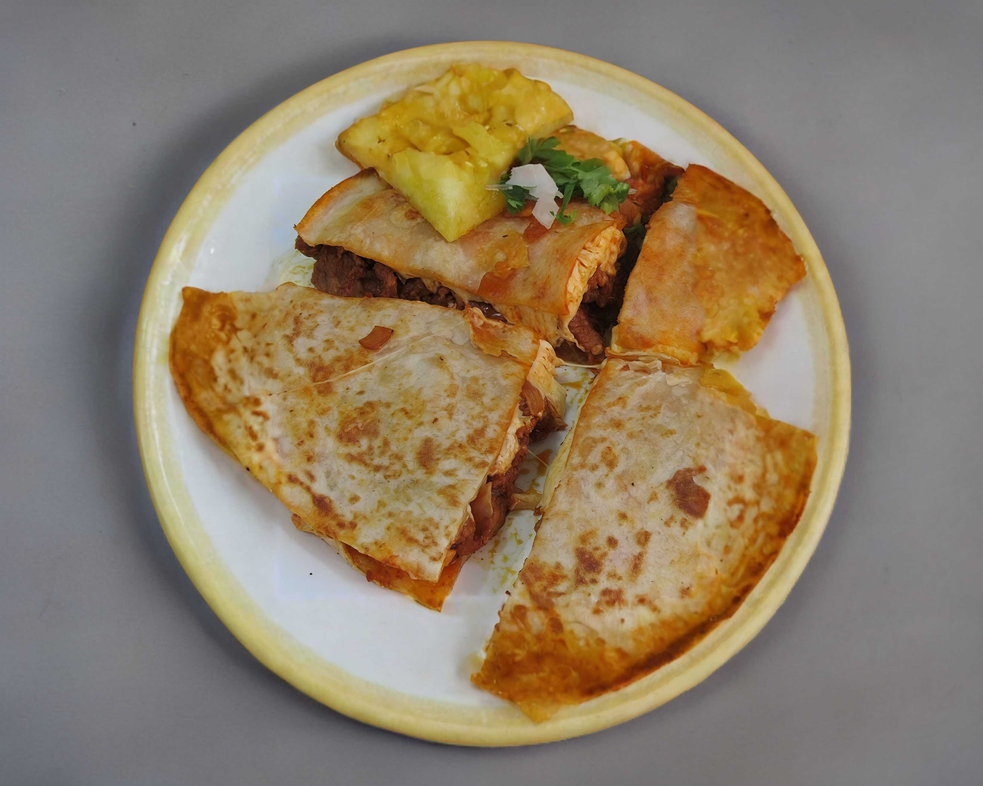 orden de tres quesadillas en tortilla de harina de arrachera con queso fundido cebolla jitomate y aguacate