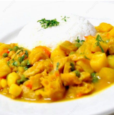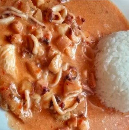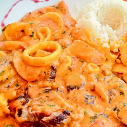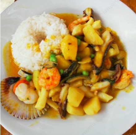 Guiso de mariscos y papa acompañado de arroz blanco.