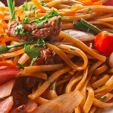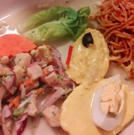 Perfecta combinación de nuestros platillos más representativos de la nuestra gastronomía peruana, papa a la huancaína, tallarines rojos y cebiche de pescado.