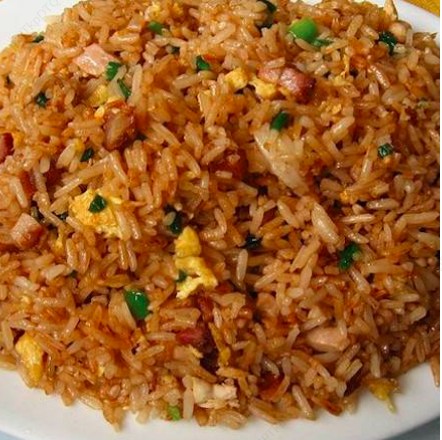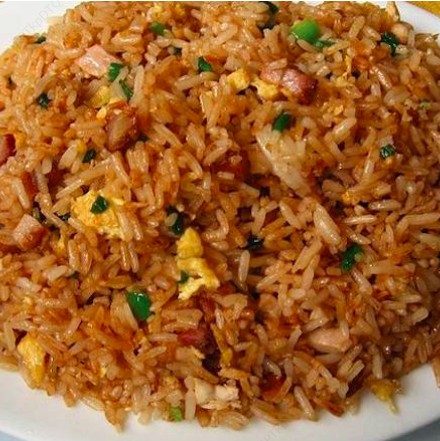 Arroz preparado con salsa de soya, verduras, huevo, cerdo, carne de res y pollo.