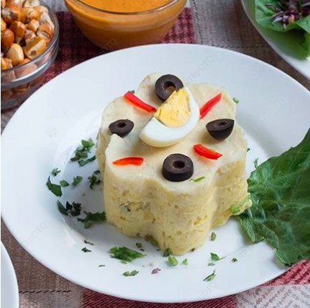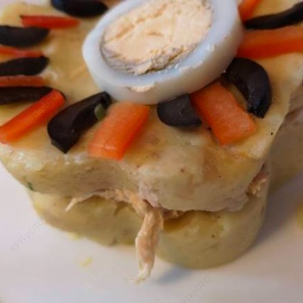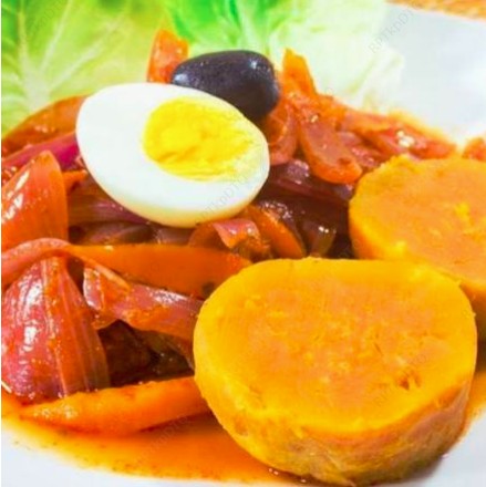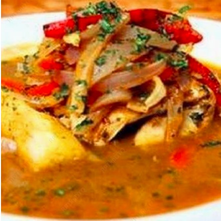 Flete de pescado sazonado con cebolla, ajo y el característico ají peruano (picante), acompañado con camote y papa, que anteriormente es cubierta con jugo que libera el pollo, lo acompaña una porción de arroz blanco y de terminación aceituna negra con huevo sancochado (cocido).
