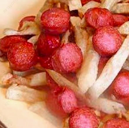 Papas y salchichas fritas acompañadas de aderezo, clásico peruano.