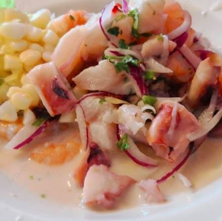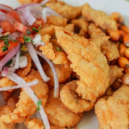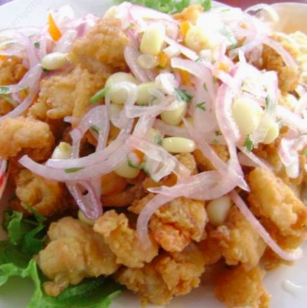Crocantes trozos de mariscos y pescado, acompañado de camote, elote cocidos y zarza criolla (mezcla de jugo de limón, cebolla morada y cilantro).