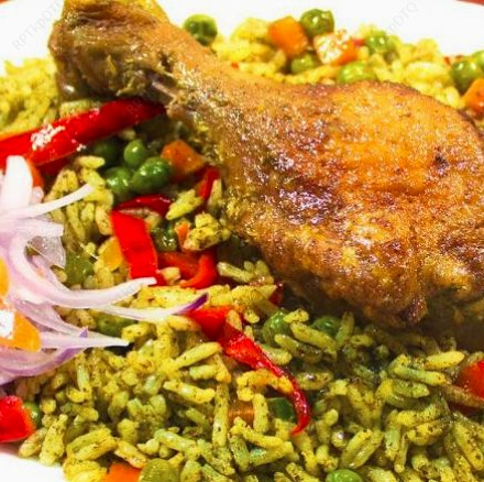 Arroz preparado con cilantro acompañado de pollo frito y zarza criolla.