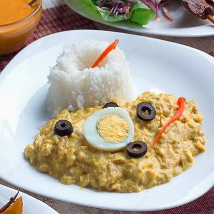 Deliciosa crema espesa hecha a base de ají, leche, maní y pechuga de pollo desmenuzado con papas sancochadas acompañada de una porción de arroz blanco.