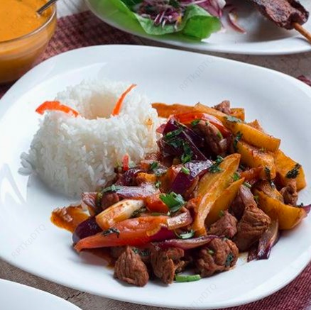 La receta clásica se elabora con carne de res, cebolla morada, tomate, papa dorada, cilantro y vino tinto, acompañado de arroz blanco.