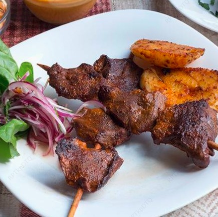 Brochetas de corazón de res sazonadas acompañada de zarza criolla. (2 piezas)