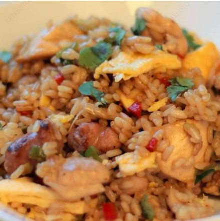 Arroz preparado con salsa de soya, verduras, huevo y pollo.