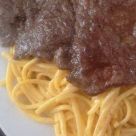 Espagueti con crema a la huancaína acompañado de bistec de res.