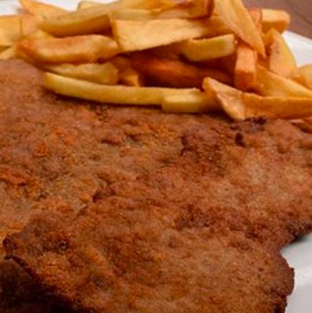Milanesa de carne de res acompañada de arroz, papas a la francesa y ensalada.