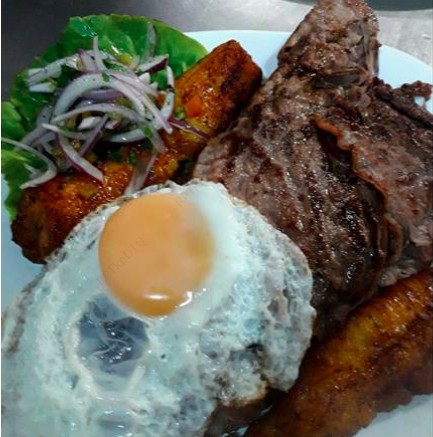 Plato completo que incluye arroz blanco acompañado de bistec, plátano frito, huevo y estrellado y zarza criolla.