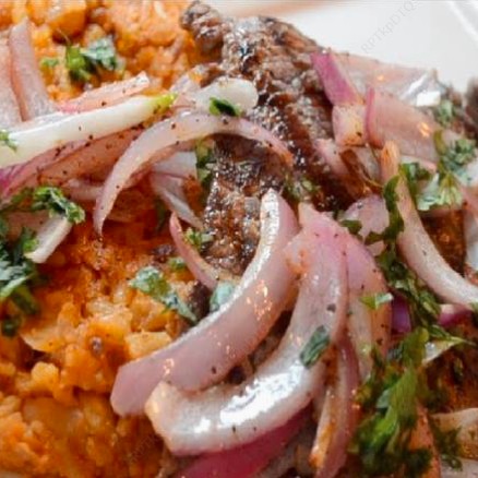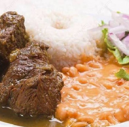 Combinación de arroz y frijol peruano acompañados de zarza criolla y bistec de res.