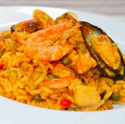 Arroz amarillo con camarón, calamar, pulpo, mejillones y jaiba.
