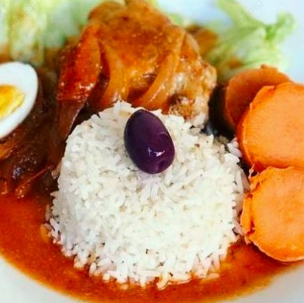 Presa de pollo, sazonado con cebolla, ajo y el característico ají peruano (picante), acompañado con camote y papa, que anteriormente es cubierta con jugo que libera el pollo, lo acompaña una porción de arroz blanco y de terminación aceituna negra con huevo sancochado (cocido).