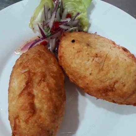 Orden de dos papas doradas rellenas con de carne, huevo, pasas y aceitunas cubiertas de salsa criolla.