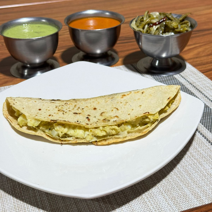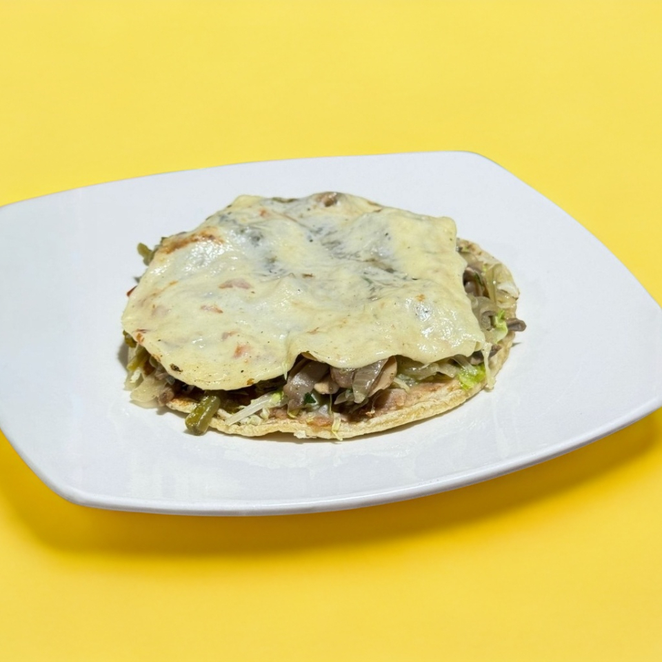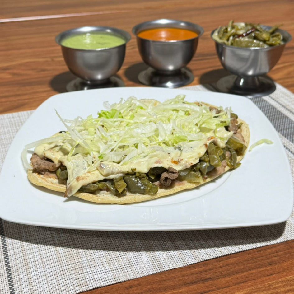 Tlacoyo del guisado de tu preferencia preparado con queso, crema y nopales, incluye salsa.