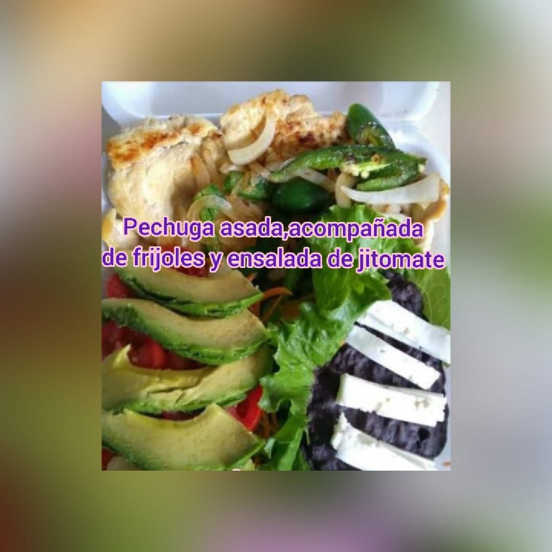 Pechuga de Pollo, con cebolla y rajas de chiles cuaresmeño acompañada de ensalada verde.