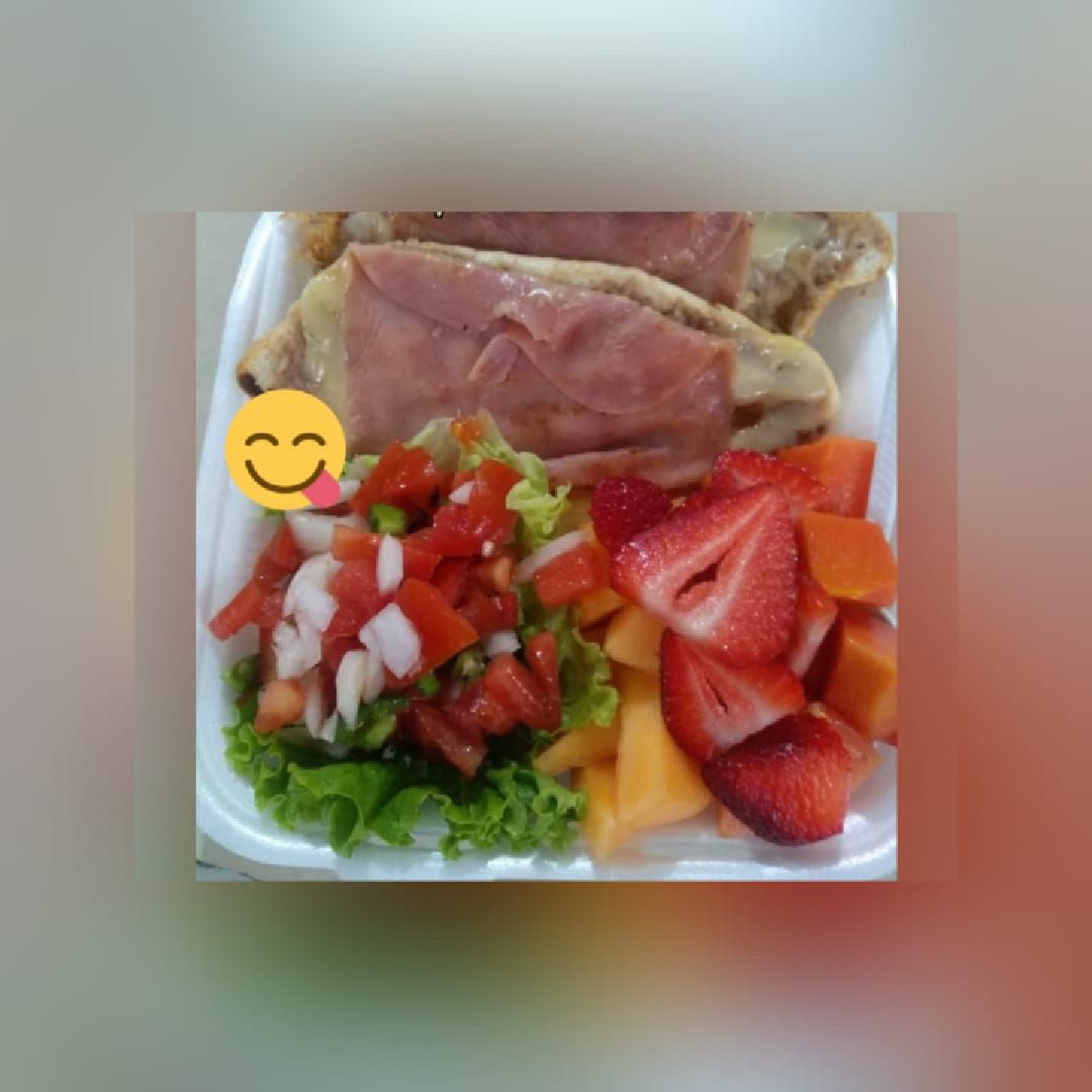 1 Sandiwch sencillo elaborado con jamon, quesillo y queso americano, fruta de temporada y cafe 10 onz