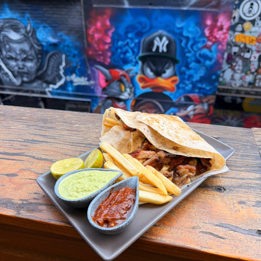 Wrap de tortilla de harina con carne de tu preferencia, con queso gouda y papas a la francesa, (jabalí, arrachera, roast beef o chorizo argentino).