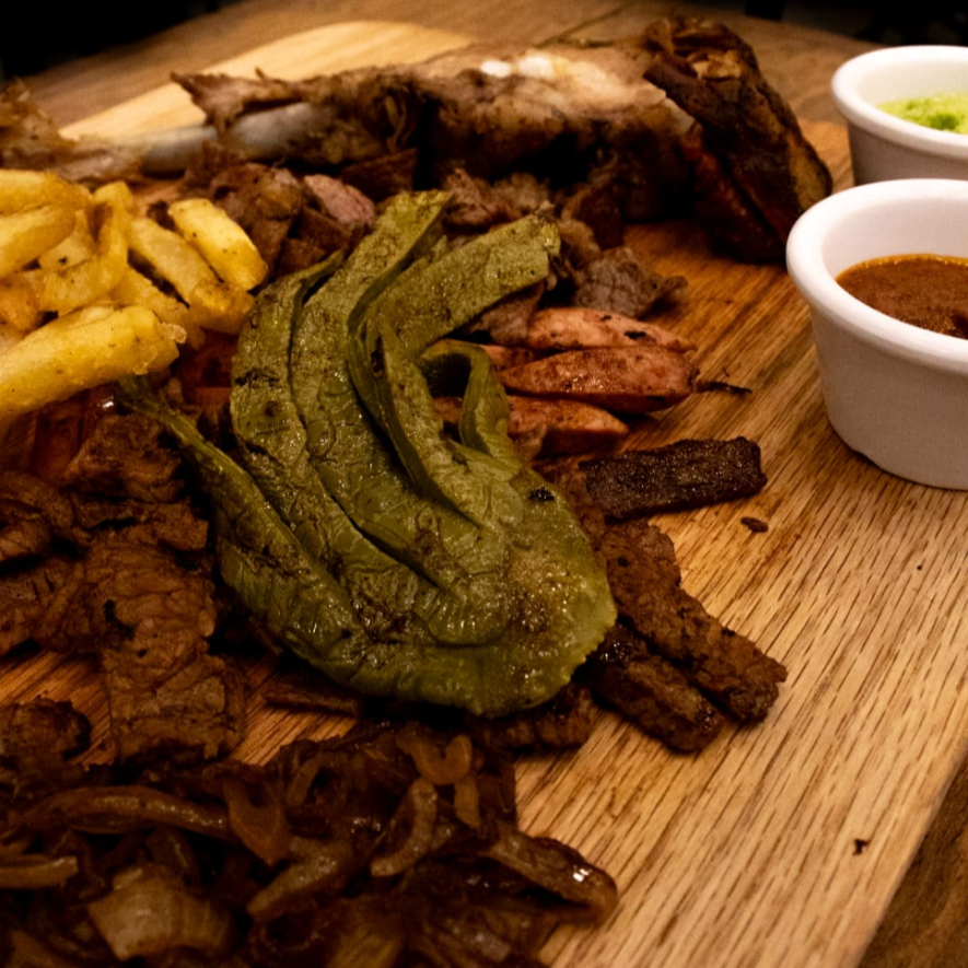 Jabalí 125 g, arrachera 125 g, roast beef 125 g, chorizo argentino 125 g. Cebollas caramelizadas, nopal, (incluye 2 refrescos de 355 ml o 2 aguas de sabor de 500 ml).