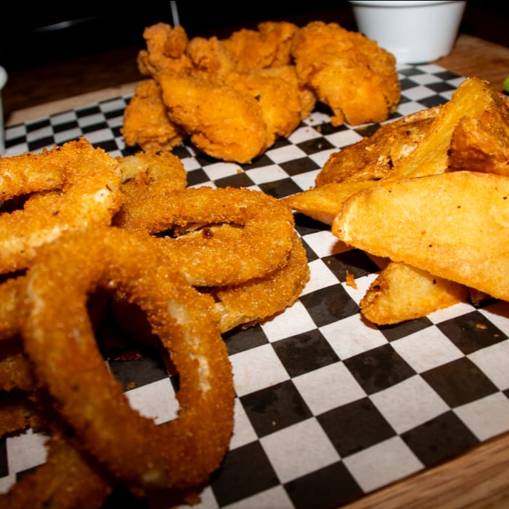 6 Piezas de Boneless de pollo con 250 g de papas a la francesa, salsas a elegir: búfalo, mango habanero, rancho o BBQ.