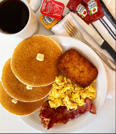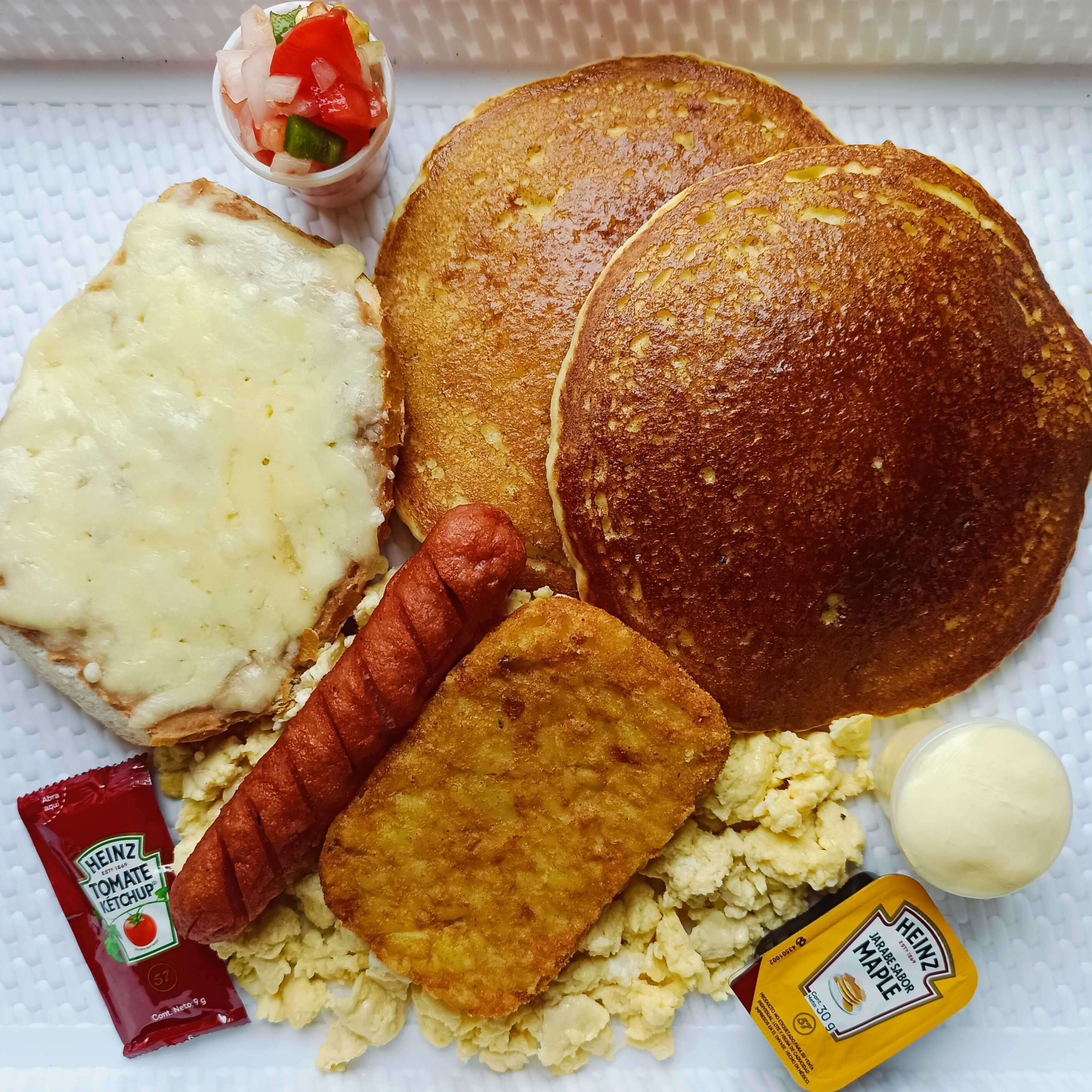 3 Hotcakes de mantequilla, 2 huevos revueltos, 2 tiras de tocino y 1 papa hash brown.