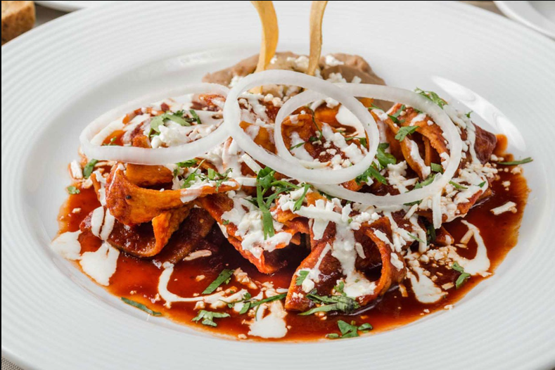 Crujientes totopos, bañados en salsa a elegir, con crema, queso, cilantro y cebolla, acompañados de 1 bolillo.