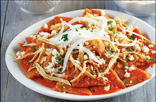 Chilaquiles con pechuga de pollo empanizada, bañados en salsa verde o roja, con queso, crema, cilantro y cebolla. acompañados de un bolillo.