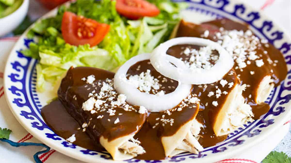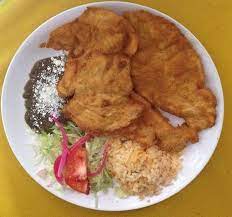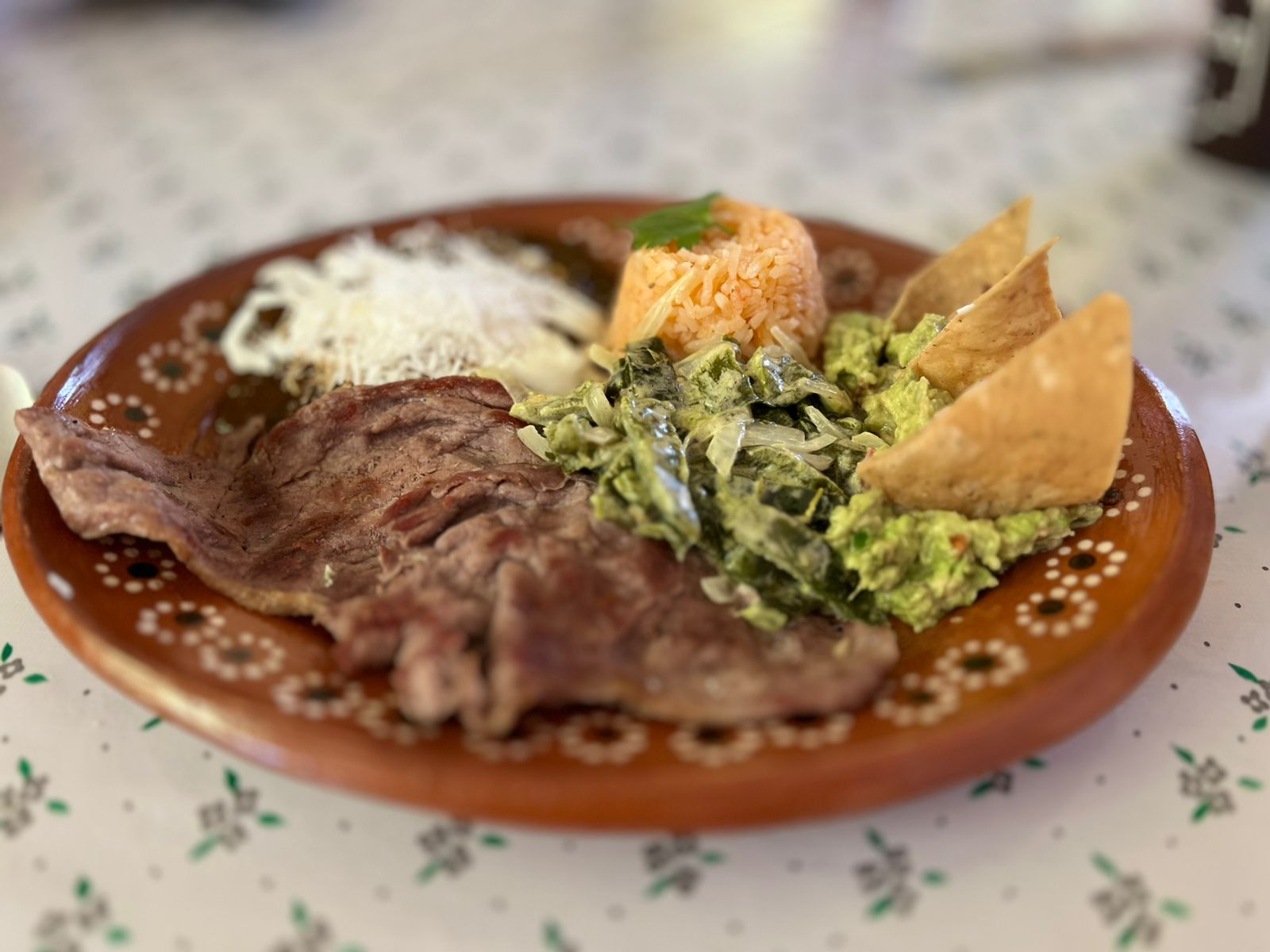 Carne asada, guacamole, arroz, rajas con crema, enmoladas (2) y frijoles refritos.