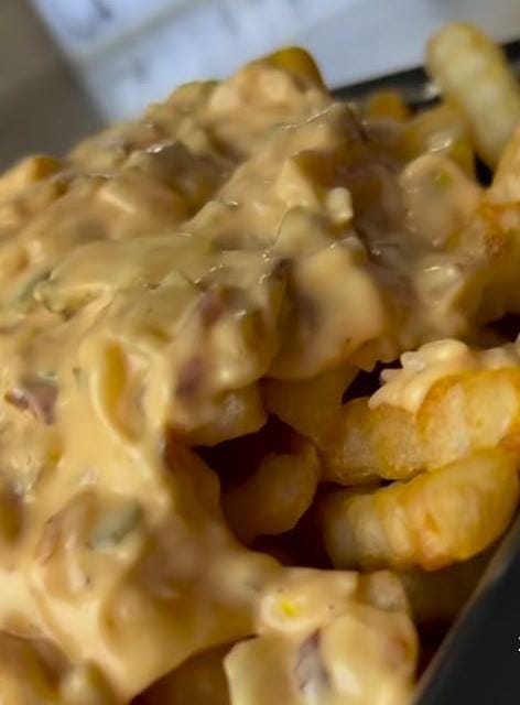 200 gramos de papas a la francesa con una cama de queso gratinado con una salsa especial a base de especias y pepenillos con una cama de cebolla caramelizada te chuparas los dedos