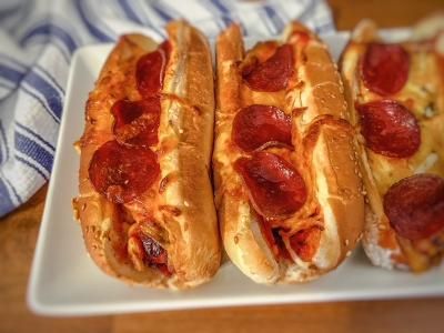 2 Pzas de pan estilo baguette, base de salsa estilo a la boloñesa, salchicha bien frita fileteada acompañada con 4 quesos gratinado.
