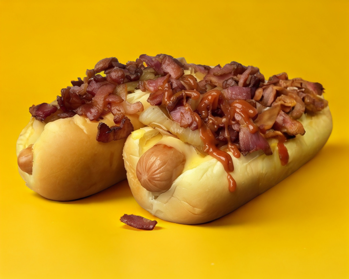 Hot dog con queso derretido una cama de cebolla caramelizada tocino dorado y un toque de BBQ