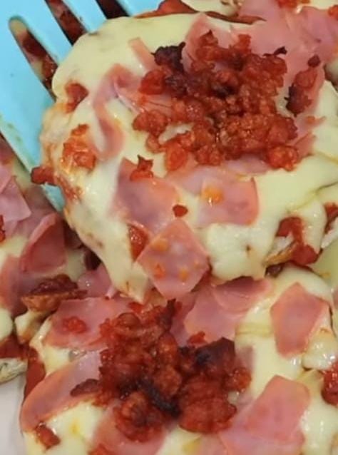 Pan de caja cortado con salsa para pizzas queso gratinado con una cama de peperonni O jamón y piña