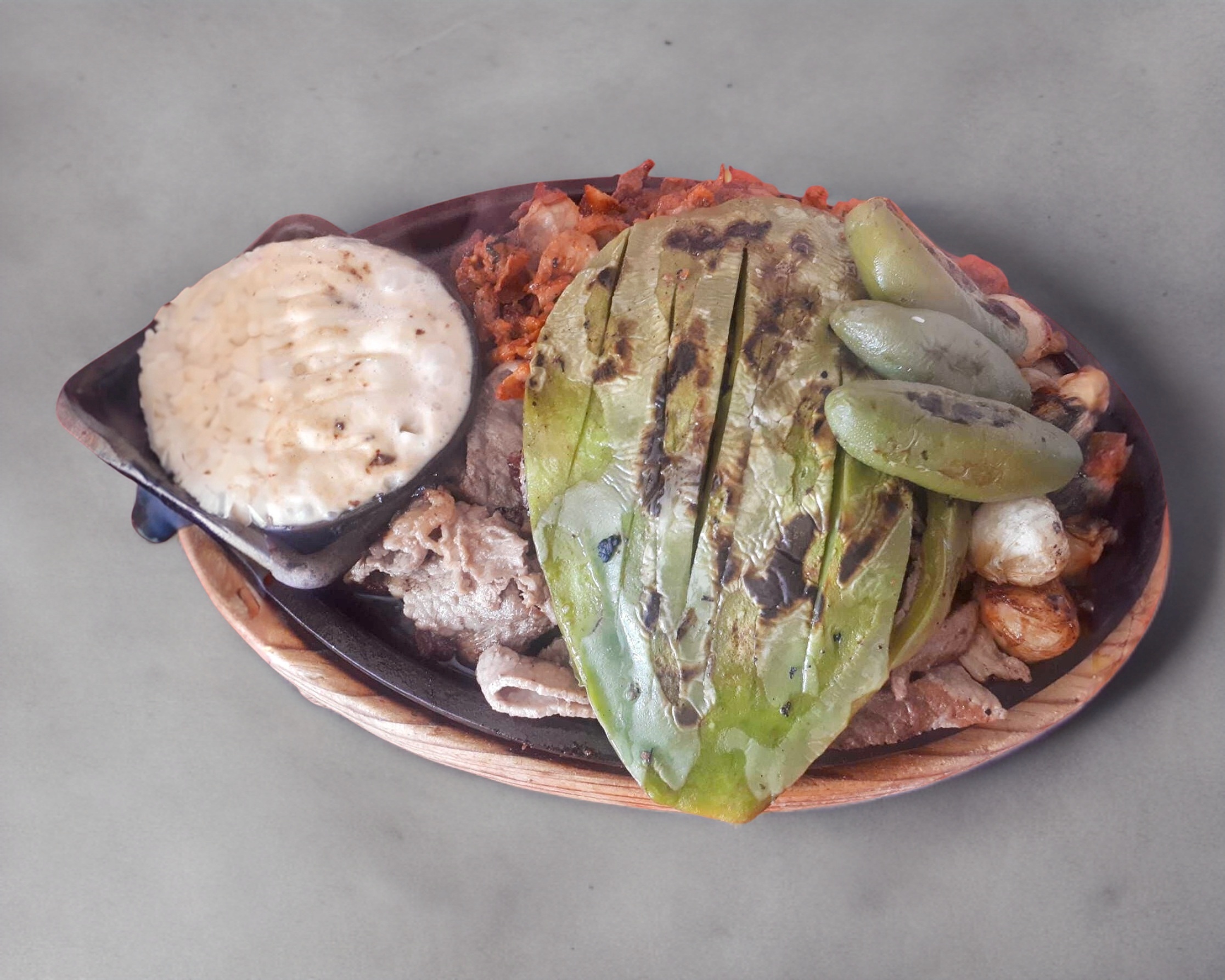 Cebollitas, nopales, chiles toreados, queso fundido.
