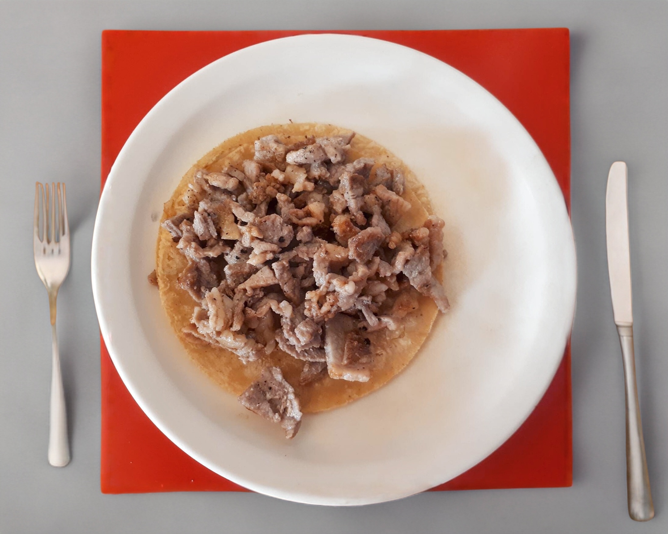 doble tortilla de harina, carne de pastor y queso.
